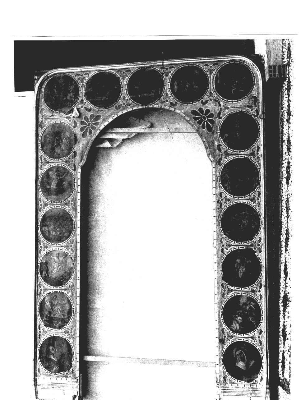 I tondi figurati sono inseriti in una cornice lignea che , in origine, sovrastava l'altare del Rosario, all'interno della chiesa, intorno alla nicchia destinata a contenere la statua della Madonna (0700040080). Il recto di questa sagoma lignea è stato rivestito con una carta dal fondo azzurro marmorizzato, con fiori e altre decorazioni geometriche in marrone, lasciando scoperti solo i tondi. Una sottile cornice dorata riveste il bordo esterno dell'insieme. Quindici tondi raffigurano i Misteri, dalla Preghiera nell'Orto alla Resurrezione; i primi due in bassi raffigurano i due Santi.. Soggetti sacri: Misteri del Rosario. Personaggi: San Domenico; Santa Caterina da Siena. Abbigliamento: (San Domenico; Santa CAterina) ecclesiastico