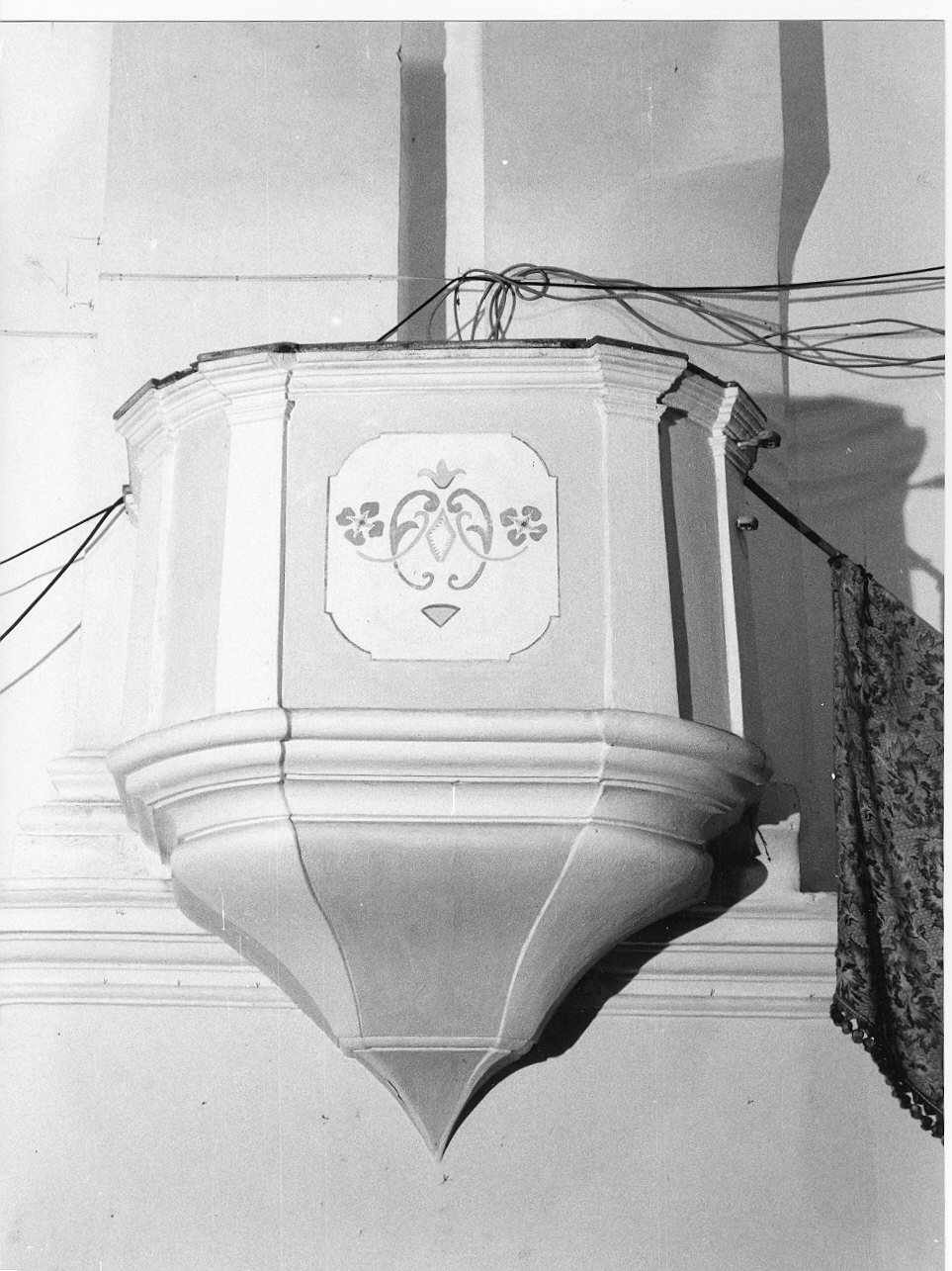 Su una base approssimativamente a piramide rovesciata poggia il pulpito. La parte esterna di essa è suddivisa in cinque facce disuguali. Il pulpito è dipinto in verde-azzurro, al centro dei tre lati principali, specchio celeste; al centro dei lato sinistro è rappresentata una losanga azzurra in cui sono inseriti dei cuori gialli. Al centro, del lato frontale, è raffigurato, in modo stilizzato, il monograma mariano in giallo e azzurro, ai lati due fiori rossi.