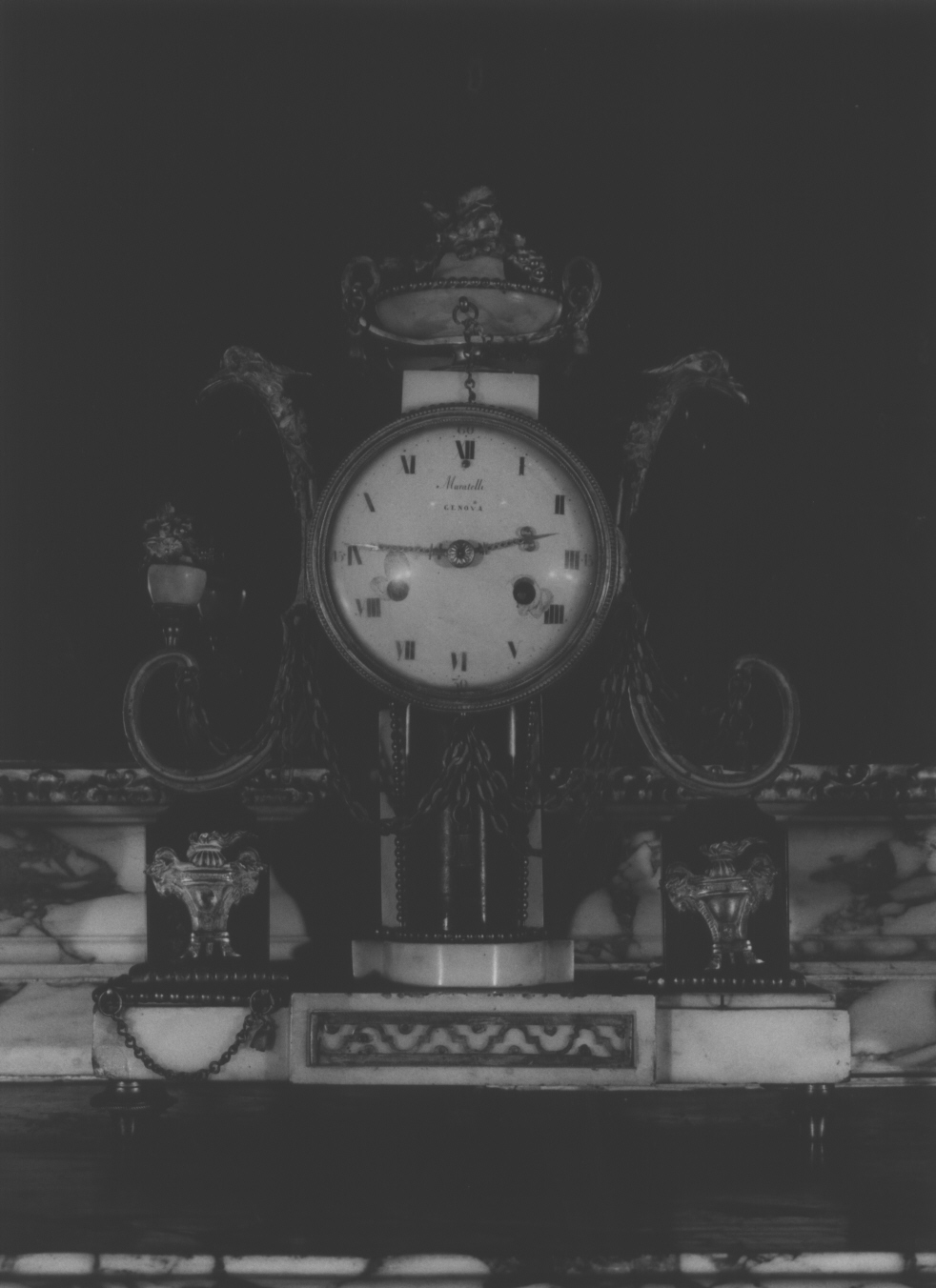 Quattro piedini in bronzo sostengono un basamento in marmo bianco sagomato, con applicazioni di perlinature in bronzo da cui si alza una semicolonna centrale in marmo nero con contorno in marmo bianco che regge la cassa sferica dell'orologio, cimata da un'anfora a navetta con applicazioni di frutta e perlinature in bronzo. Ai lati dell'orologio due pilastrini in marmo nero e ornati in bronzo sostengono un'alta voluta in bronzo terminante a testa di aquila in alto e in basso in un piccolo vaso di marmo bianco con frutta in bronzo.. Decorazioni: frutta; volute