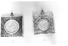 Medaglia battesimale raffigurante la Natività: lamina d'argento sbalzato e inciso, profilo in argento dorato e cornice in fiori di filigrana. L'interno del medaglione è occupato, come spessore, da un ritaglio di carta da parati.
