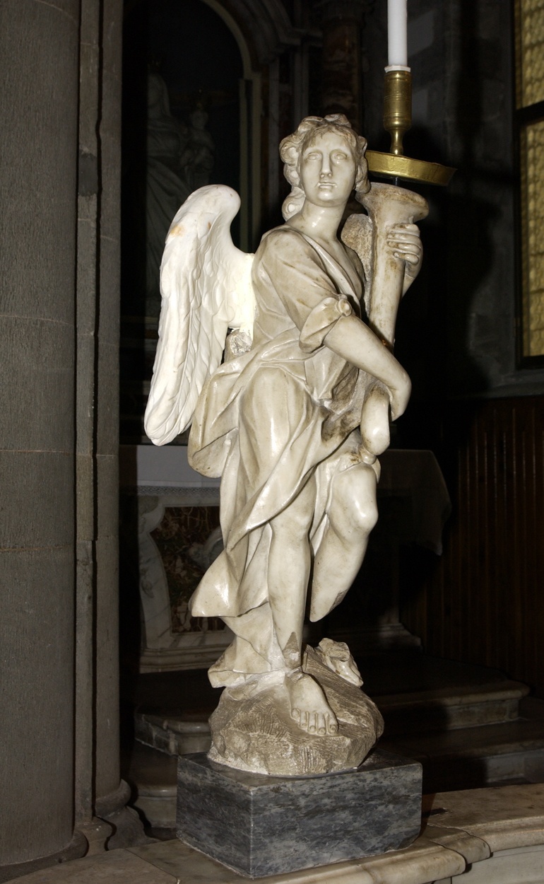 L'ANGELO, CHE REGGE CON ENTRAMBE LE MANI UNA SORTA DI CORNUCOPIA REGGICERO, HA UN ANDAMENTO LEGGERMENTE TORTILE. IL VOLTO SI VOLGE VERSO DS, LA GAMBA SIN E' LEGGERMENTE FLESSA E LE GAMBE SONO LASCIATE SCOPERTE SOPRA IL GINOCCHIO. LA VESTE, MOVIMENTATA DA PIEGHE, E' TRATTENUTA DA FERMAGLI TONDEGGIANTI CON BORCHIA CENTRALE.