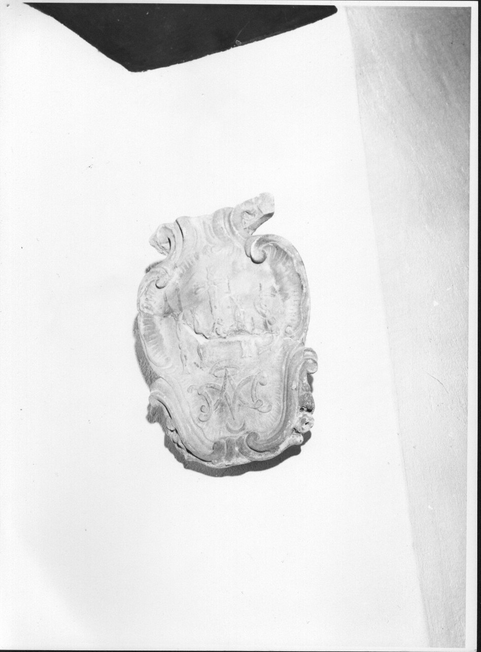 Lo stemma ha forma pressochè ovale, contornato da motivi a conchiglia e pelacette di volute; il fastigio è a volute.