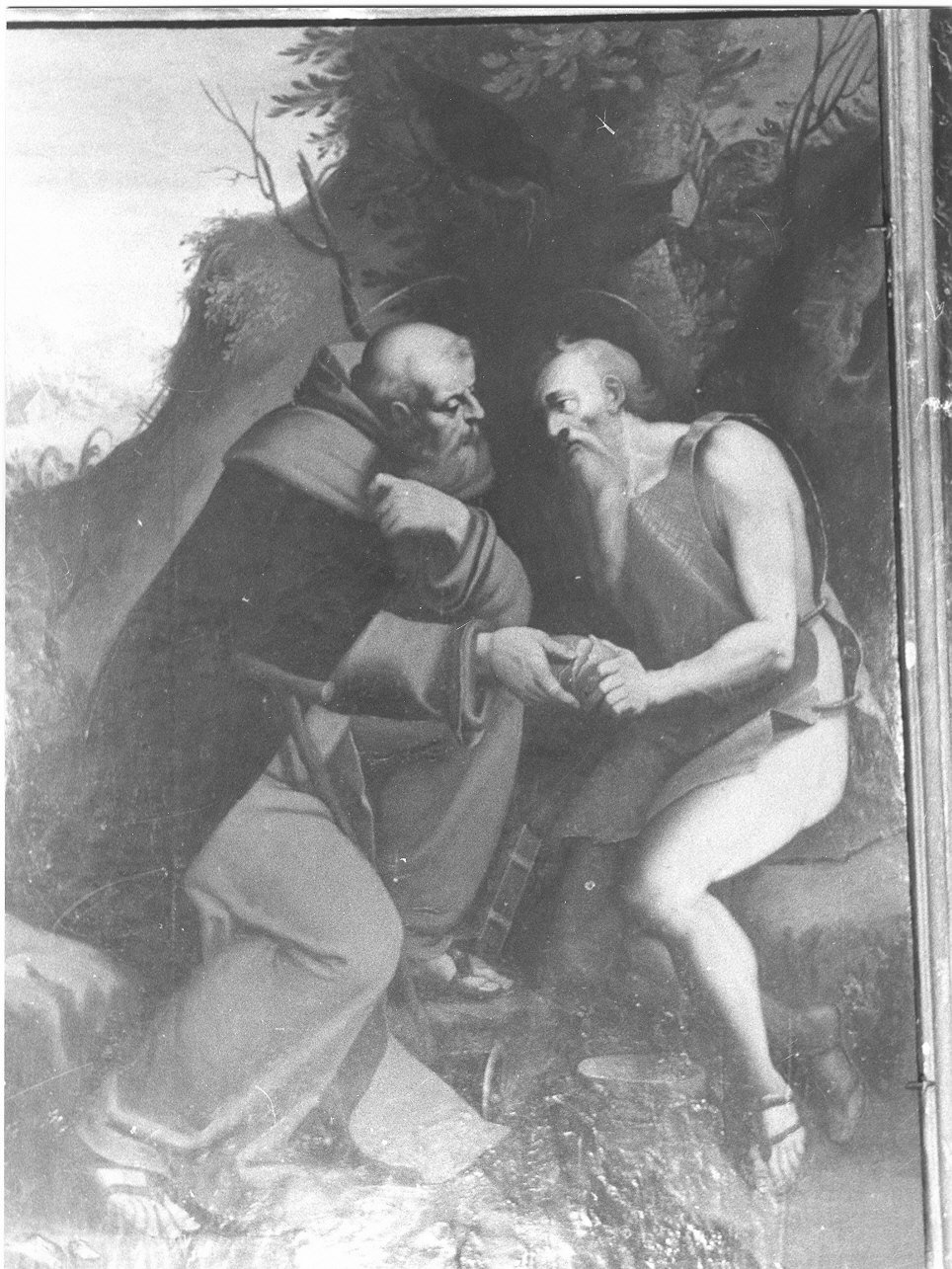Personaggi: San Paolo; Sant'Antonio Abate. Attributi: (Sant'Antonio) bastone; campanella. Abbigliamento religioso. Oggetti: libro; pane; ciotola. Animali: corvo. Paesaggi: colline; alberi; rocce; paese