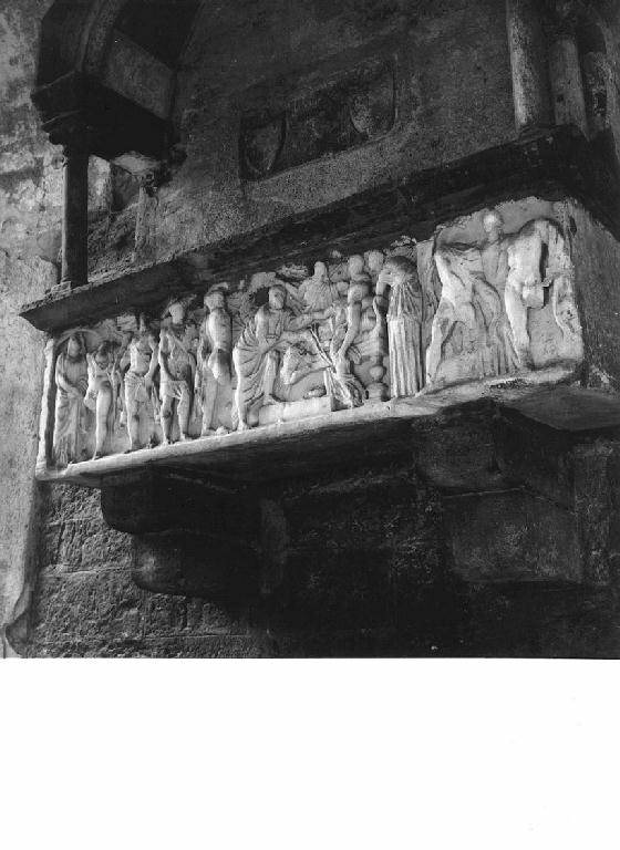 SARCOFAGO A CASSA COPERTO CON LASTRE DI PIETRA INSERITO NELLA STRUTTURA DELLA TOMBA AD ARCOSOLIO. SEGNI DI FORI NELLE DUE PARTI LATERALI. MITO DI ALCESTI ARTICOLATO IN TRE EPISODI: AL CENTRO LA DEFUNTA DISTESA SU UNA KLINE, ATTORNIATA DAI DUE FIGLI, DAI PARENTI E DALLE ANCELLE PIANGENTI. A SINISTRA IL RITORNO DI ALCESTI DALL'ADE, ACCOMPAGNATA DA ERCOLE. A DESTRA IL CONGEDO DEI DUE SPOSI RIUNITI DALL'EROE SALVATORE (GIGLIOLI, 1953).