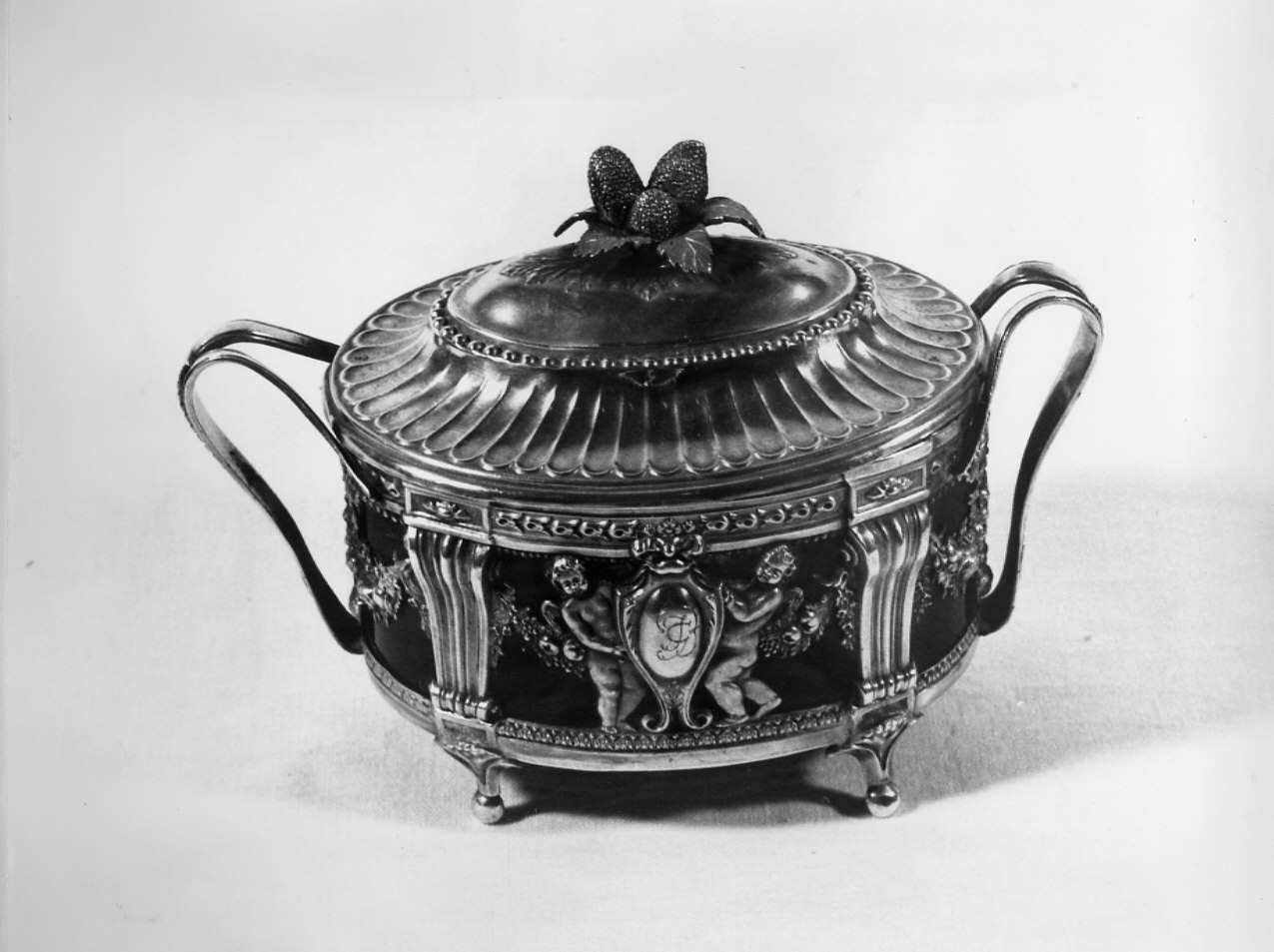 Il recipiente vero e proprio è in pasta di vetro blu scuro, la struttura in argento, poggiante su quattro piedini, è decorata da festoni fioriti, intervallati da quattro lesene. Due putti a tutto tondo reggono un cartiglio con un monogramma. Il coperchio è a lobi in argento sbalzato, conclusi da una decorazione a perline. Il pomolo è foggiato a gruppo di fragole.