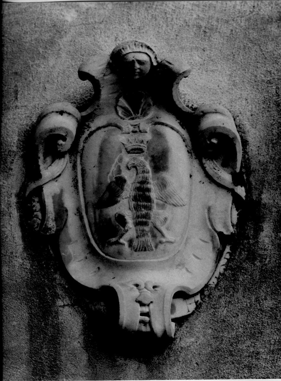Stemma a volute culminanti alla sommità in una testina femminile, racchiudenti la raffigurazione di un'aquila imperiale. L'iscrizione a margine dello stemma è spezzata e non più leggibile.. Decorazioni: testa femminile; conchiglia; volute. Araldica: aquila. Attributi: (aquila) corona