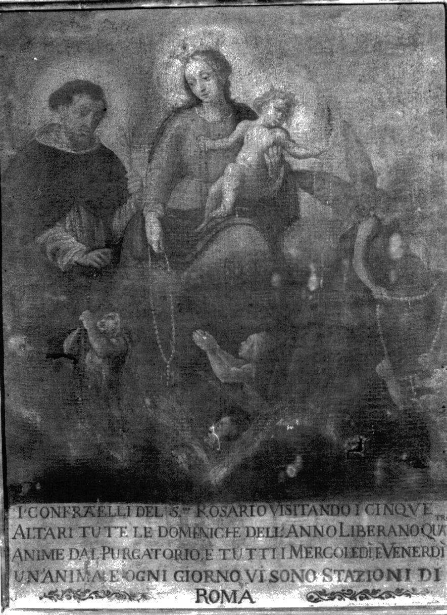 Personaggi: Madonna; Gesù Bambino; San Domenico. Attributi: (Madonna) Rosario; (San Domenico) Rosario; (Gesù Bambino) Rosario. Figure: anime purganti. Oggetti: iscrizione