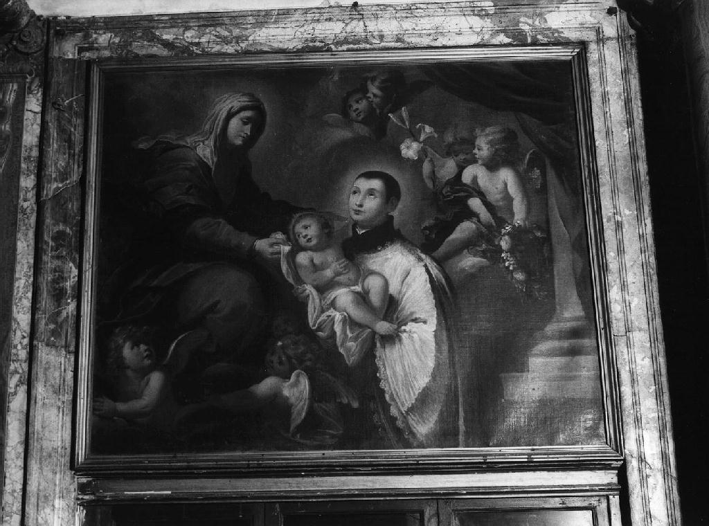 Tela tesa su telaio. San Stanislao Kotska, raffigurato al centro, riceve dalle mani della Vergine il bambino. La scena è occupata da putti e cherubini.. Figure