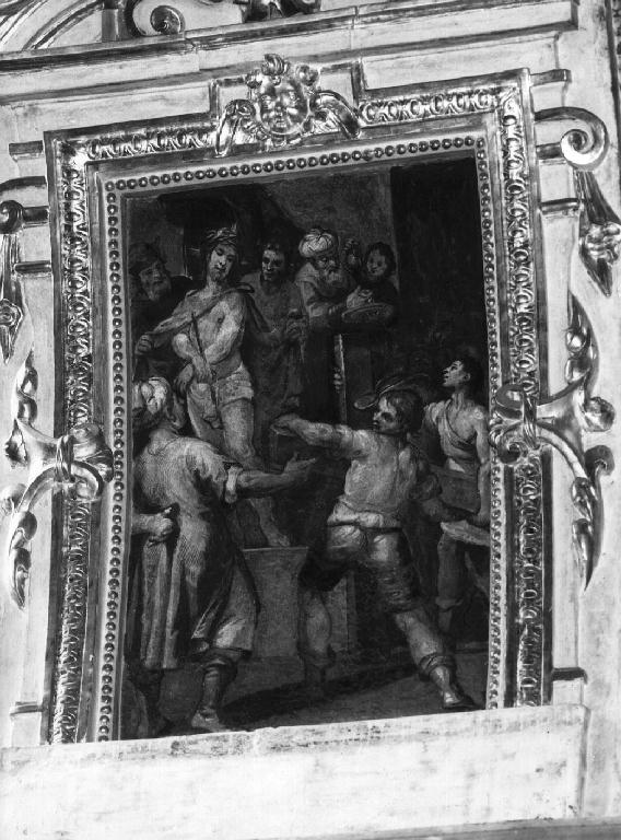 Superficie concava, riquadratura in stucco dorato. A Cristo, seminudo e con la corona di spine, viene portata la croce del martirio.. Figure