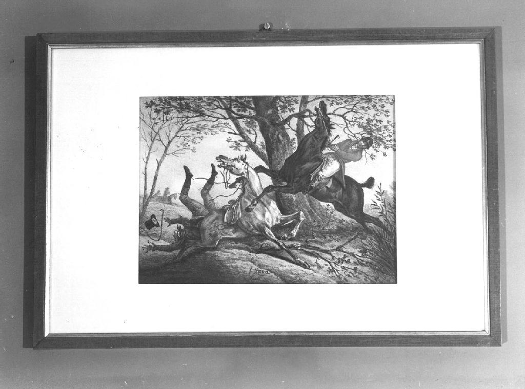 CADUTA DA CAVALLO DOPO SCONTRO FRA DUE CAVALIERI (stampa colorata a mano)