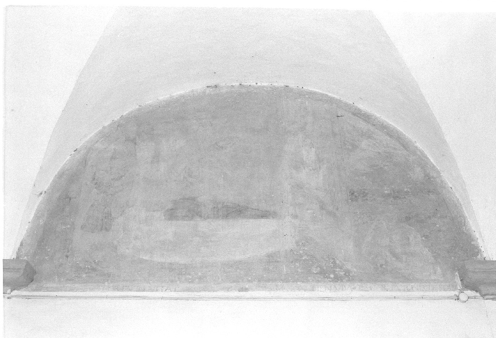 Al centro è un catafalco con drappo bianco su cui è disteso un frate; a sinistra è un gruppo di figure stanti, in basso a destra: una figura inginocchiata.. Ecclesiastici: frate. Figure: donna. Figure femminili. Figure maschili