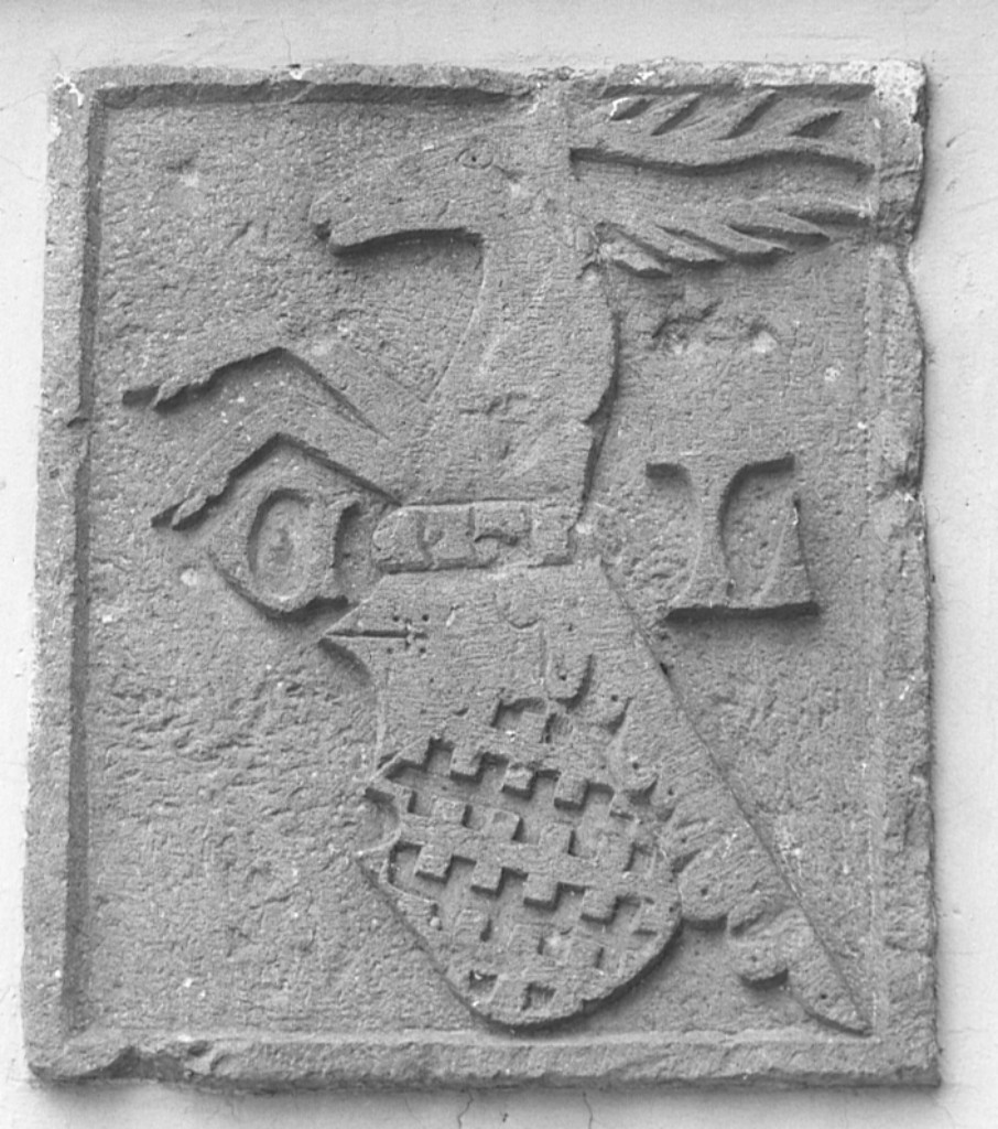 cervo rampante su elmo e scudo con tre file di croci sovrapposte; ai lati le lettere A e L.
