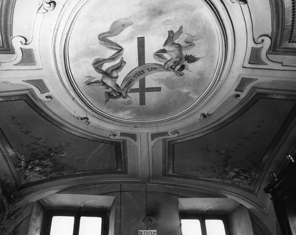 Figure: angeli. Oggetti: croce; drappo. Fenomeni metereologici: nuvole