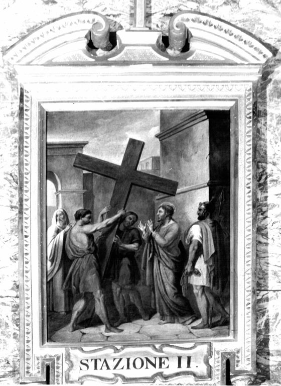 Personaggi: Pilato; Cristo. Figure: soldati; servo; carnefici. Elementi architettonici: colonna; nicchia. Oggetti: brocca; lancia; fascio; bacile