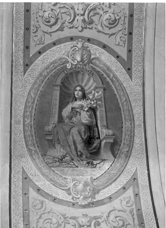 Personificazioni: temperanza. Attributi: (Temperanza) fascio di gigli; ramo con spine. Architetture: trono