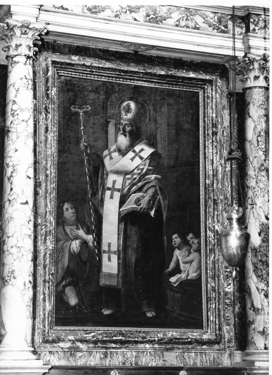 Personaggi: San Nicola di Bari. Abbigliamento religioso: abiti vescovili di tipo orientale. Attributi: (San Nicola di Bari) tiara; pastorale a forma di tau; vangelo con tre globi d'oro. Figure: bambini; giovane. Interno