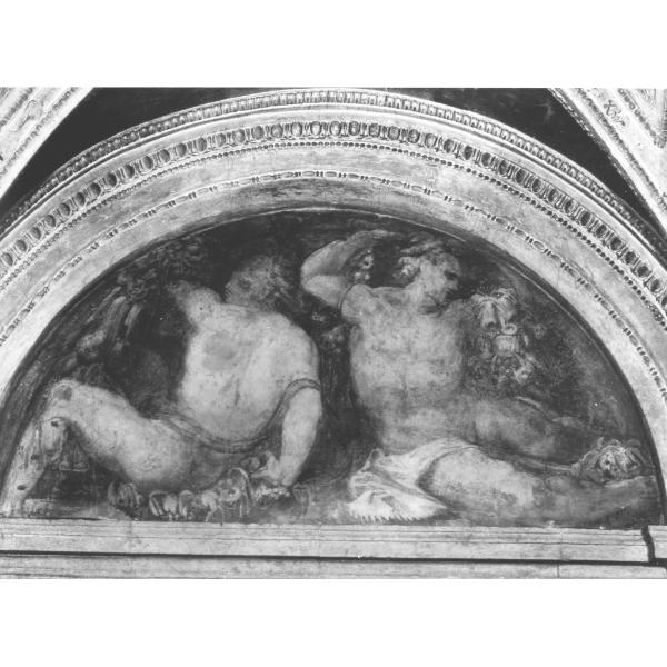 Nella lunetta, inquadrata da cornice in stucco bianco e oro, sono dipinte due figure maschili nell'esiguo spazio, insieme a festoni di fiori e frutta. A sinistra la figura è di spalle.. Figure: uomini. Fiori. Frutti
