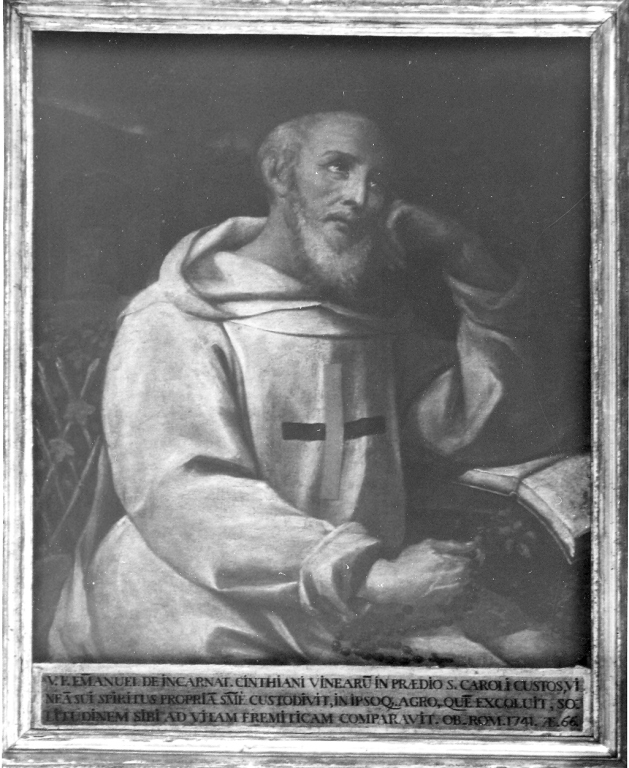 Ritratti: Venerabile Emanuele dell'Incarnazione. Personaggi: Emanuele dell'Incarnazione. Abbigliamento religioso. Oggetti: libro; staccionata
