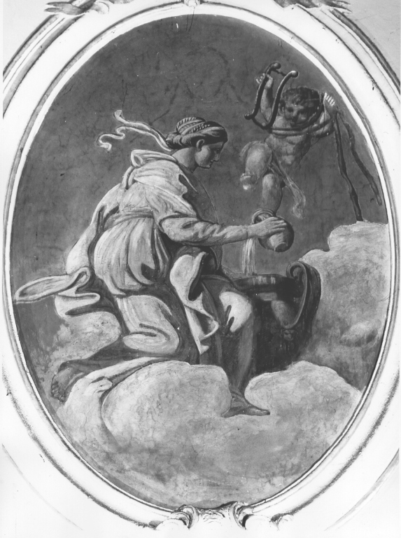 La Temperanza è in atto di travasare l'acqua da un vasetto ad un'anfora, mentre un putto regge un oggetto non identificabile.. Virtù cardinali: Temperanza. Attributi: (Temperanza) vasetto; anfora. Figure: putto