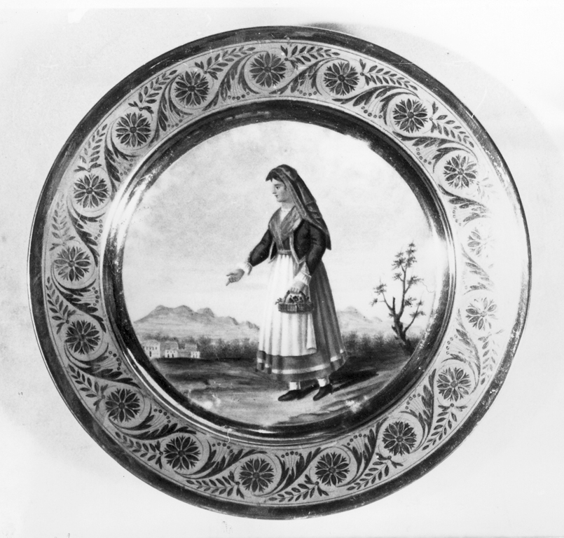 piatto circolare con tesa dorata integralmente decorata a motivo a girali vegetali e floreali; al centro, raffigurazione di donna in costume popolare con cestino in un paesaggio