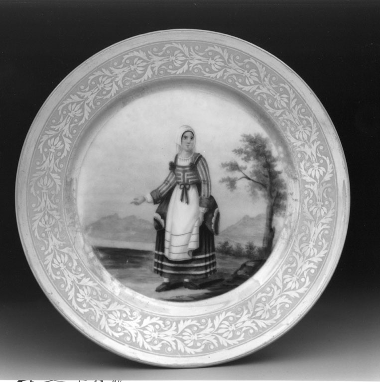 piatto circolare con tesa dorata integralmente decorata a motivo vegetale; al centro, raffigurazione di donna in costume popolare in un paesaggio