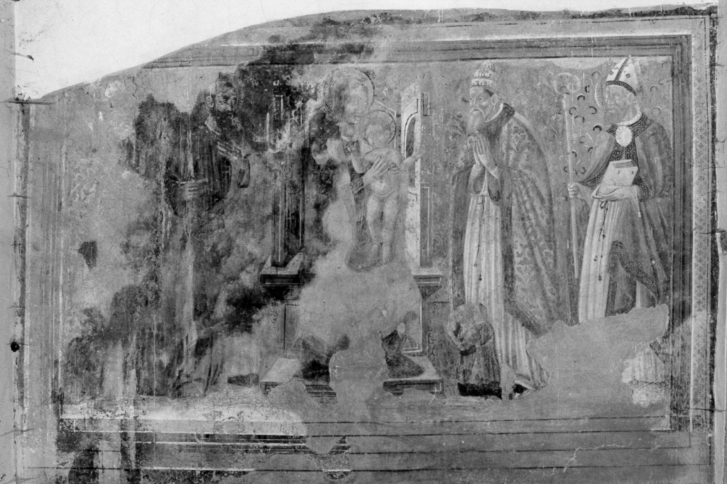 Personaggi: Madonna; Gesù bambino. Figure maschili: Santi; donatori
