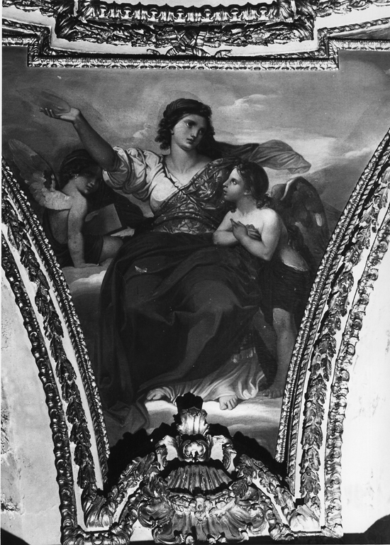 Accanto alla figura della donna seduta sulle nubi con la mano destra alzata, stanno due angioletti di cui quello a sinistra tiene in mano un libro.. Figure: Virtù; libro; angeli