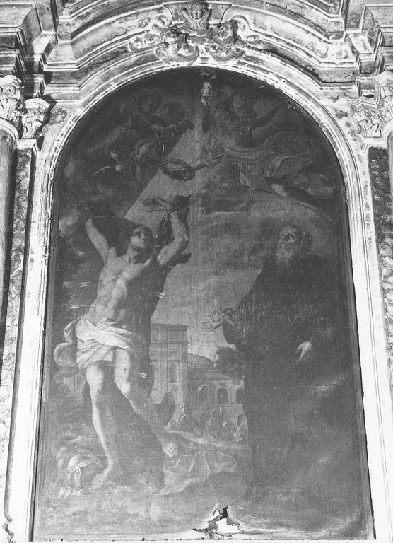 Sulla sinistra della tela è raffigurato San Sebastiano col corpo trafitto dalle frecce, mentre S. Antonio Abate è sul lato destro. Da uno squarcio del cielo scendono angeli a coronare in martirio del santo. L'altare sottostante ho un paliotto dipinto a motivi floreali assai vivi assegnabile al sec. XVIII.. Personaggi: San Sebastiano; Sant'Antonio Abate
