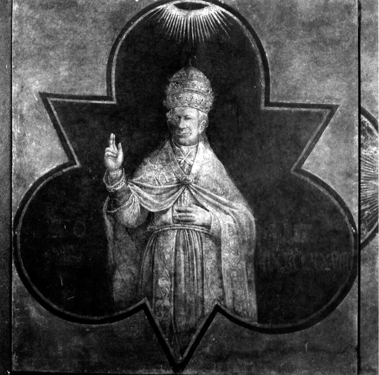 Nell'affresco è ritratto il papa Leone XIII benedicente, illuminato da una corona di raggi spioventi dall'alto, in una losanga azzurra dalle cornici oro ed ocra su fondo terreo.Il ricco piviale damascato d'oro è trattenuto sul petto da una fibula con gemme blu e bianche. Al di sotto si intravedono il rocchetto, il cingolo ed una ricca stola damascata in oro. Il capo è coperto dal triregnum dalle corone auree con gemme blu e rosse, sormontate dalla piccola croce.. Personaggi: papa Leone XIII