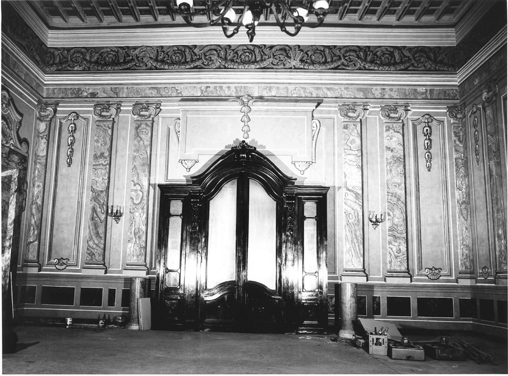 In alto fregio con festoni vegetali, poggiante su finto cornicione sorretto da lesene a finto marmo con capitelli ionici; al centro cornici mistilinee con motivi decorativi vegetali.. Decorazioni: motivi vegetali; festoni