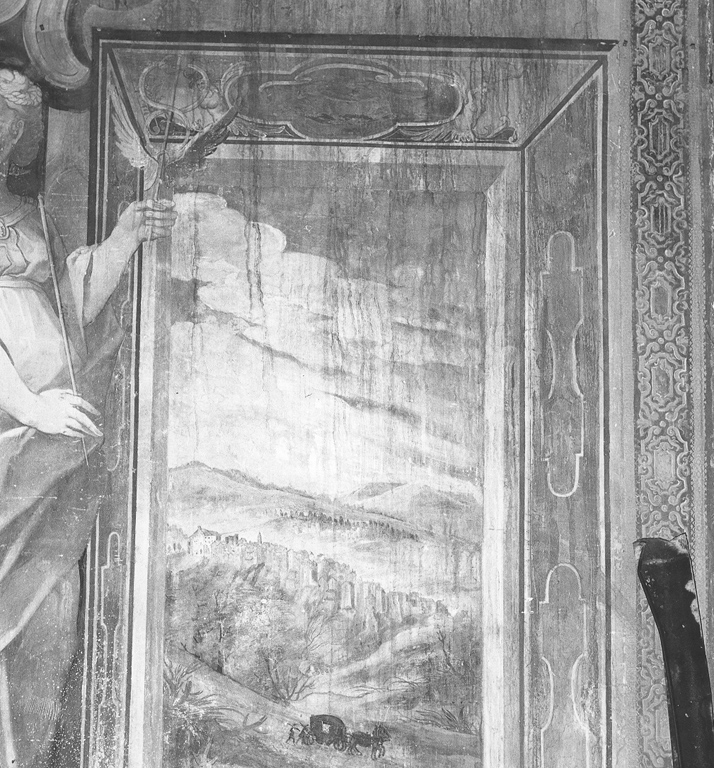 Attraverso una finta finestra vista in prospettiva si vede un paesaggio identificabile con una veduta di Poli. Sopra la finestra è un festone di frutta.. Vedute: paesaggio