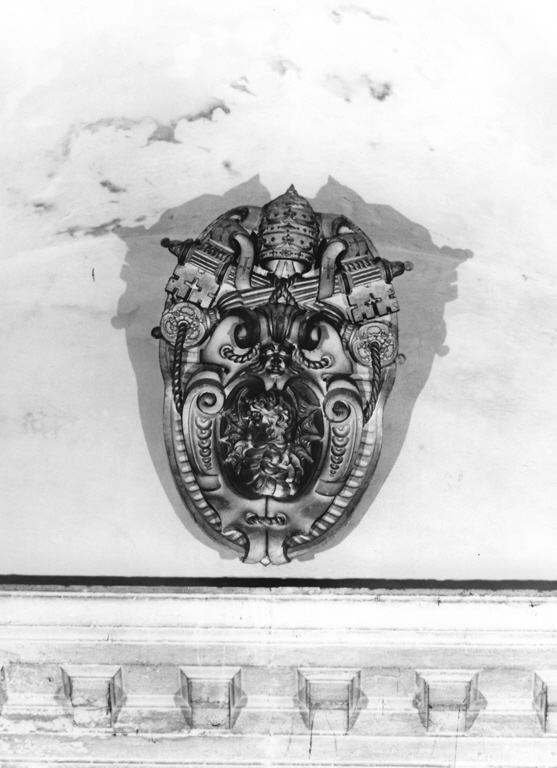 manufatto di forma ovale scolpito a rilievo nella metà superiore con mitria papale e chiavi incrociate e nella metà inferiore con volute ed incavi. araldica: (GREGORIO XIII PAPA) drago rampante