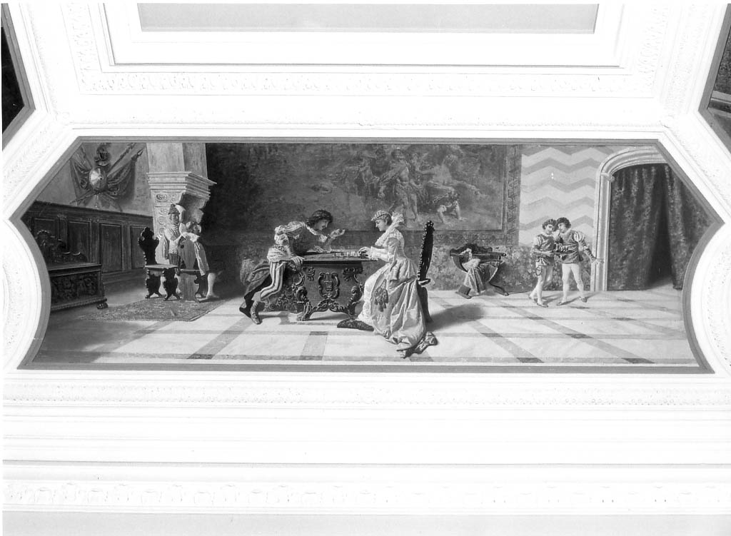 Figure: fanciullo; fanciulla; due paggi; due uomini. Mobilia: tavolo; panche; sedie. Oggetti: arazzo; scacchi