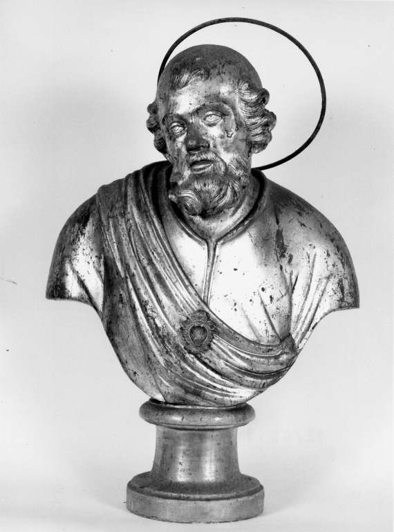 Il Santo è ritratto nelle vesti di Apostolo, secondo l'iconografia tradizionale. Al centro del busto è praticata una piccola urna nella quale è contenuta la reliquia.. Personaggi: San Pietro