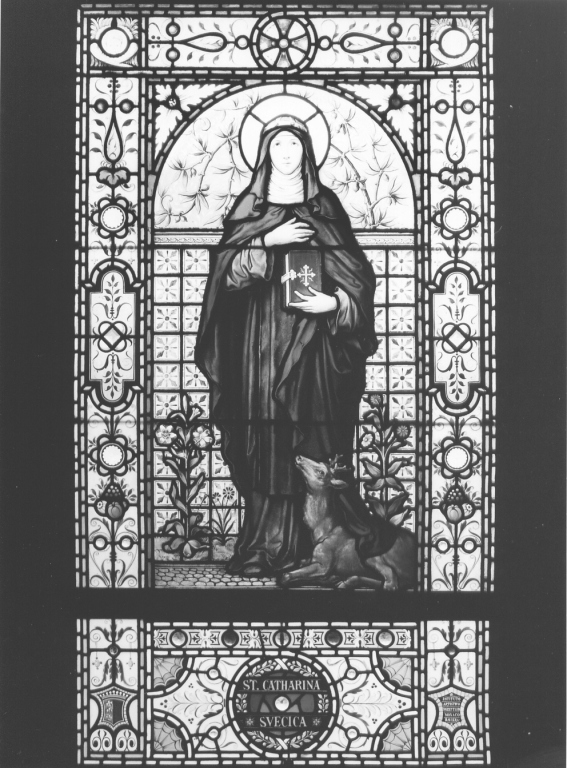Vetrata policroma divisa in due registri; nel superiore, entro cornice floreale, è raffigurata Santa Caterina di Svezia in abiti monacali con libro e cervo ai suoi piedi; registro inferiore con clipeo fra cornici contenente corona floreale con iscrizione; ai lati rispettivamente stemma dell'Ordine brigidino e segnalazione della ditta esecutrice.. Personaggi: Santa Caterina di Svezia. Attributi: (Santa Caterina di Svezia) cervo; libro. Fiori