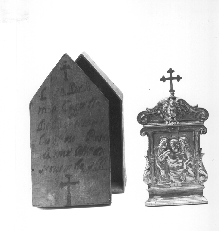 Pace a forma di tavoletta architettonica mistilinea, il frontone ha volute e un cherubino, nella parte superiore si trova una croce con bracci a terminazioni trilobe apicale.