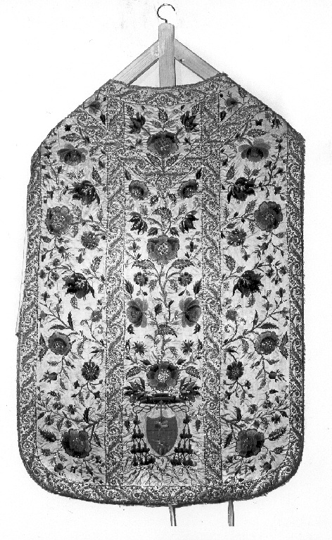 La pianeta è divisa dai galloni in tre fasce ornate da un unico grande motivo foloreale, le corolle sono ricamente in rosa e lilla, quelle piccole in azzurro. Le decorazioni forate sono formate da fili di questo colore e da paillettes accostate.