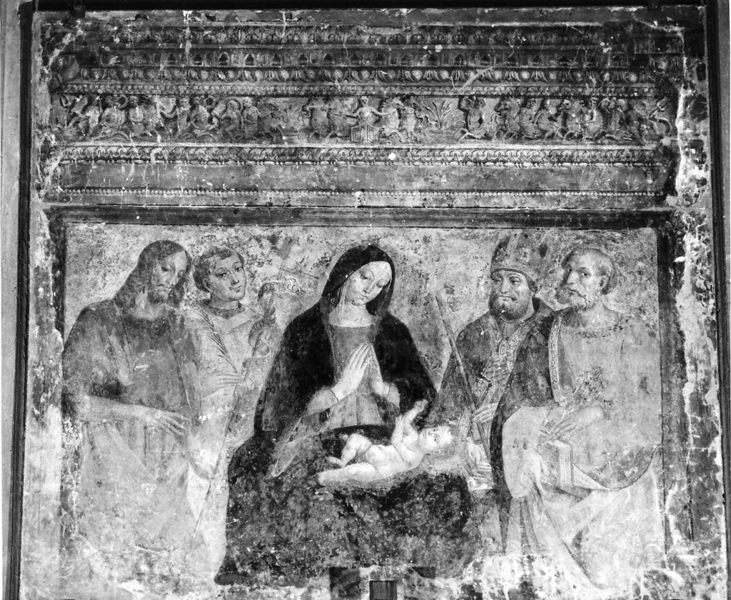 La Vergine al centro con le mani giunte e lo sguardo volto al Bambino adagiato sulle ginocchia è affiancata dai quattro santi recanti i rispettivi attributi. In alto fascia decorativa con il carro del sole al centro e tritoni e nereidi in lotta.. Personaggi: Madonna; Gesù Bambino; San Giovanni Battista; Santo Stefano; San Biagio; San Pietro. Attributi: (San Giovanni Battista) bastone; cartiglio; (Santo Stefano) abbigliamento religioso; pietre; (San Biagio) abbigliamento religioso; pettine cardatore; (San Pietro) libro; chiavi