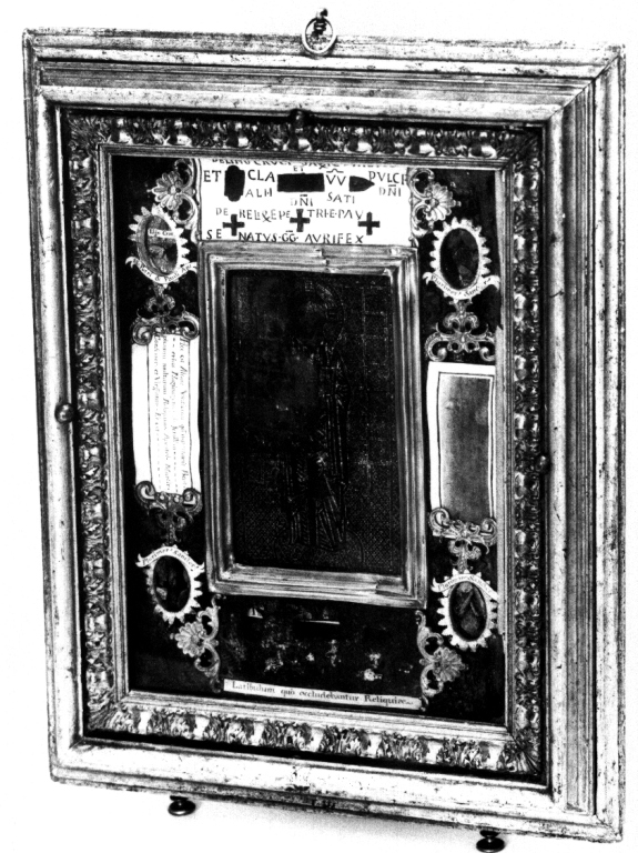 L'altarolo si compone di una cornice lignea a listelli sagomati e al centro è collocata la lamina d'argento ornata con micromosaico. Intorno quattro teche ovali contengono le reliquie dei santi indicate in cartigli.. Personaggi: Cristo Redentore