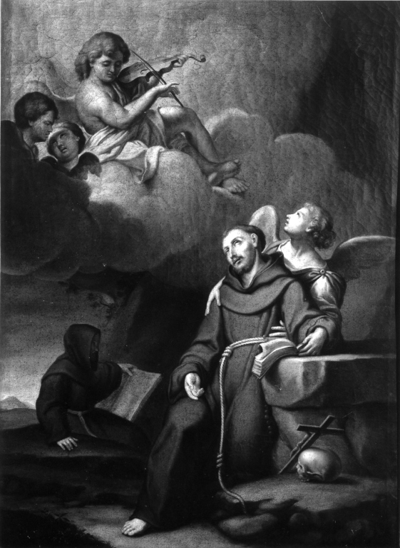 Personaggi: San Francesco d'Assisi. Attributi: (San Francesco d'Assisi) croce; teschio; libro. Figure: frate; angelo; angelo con violino; cherubini