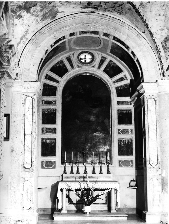 Decorazione pittorica suddivisa in due riquadri rettangolari per ciascuna delle pareti laterali della cappella e in otto piccoli riquadri distribuiti nella cornice in stucco della pala d'altare.