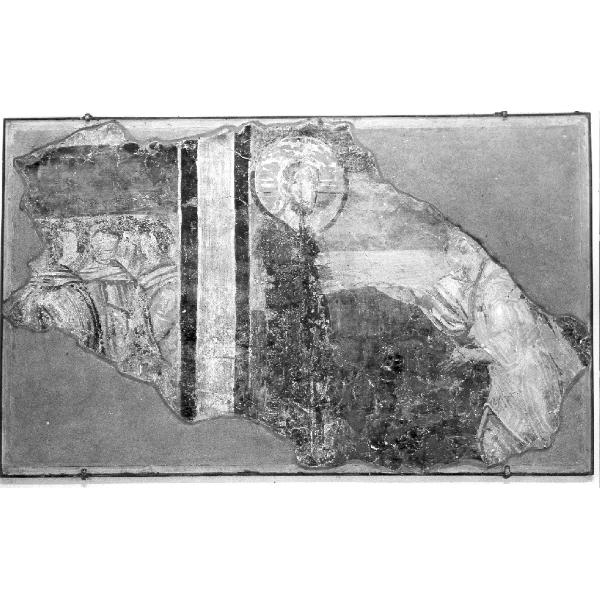 Cristo che afferra la mano di Pietro. Il fondo è costituito da strisce orizzontali dipinte in vari colori.. Personaggi: Gesù Cristo; San Pietro