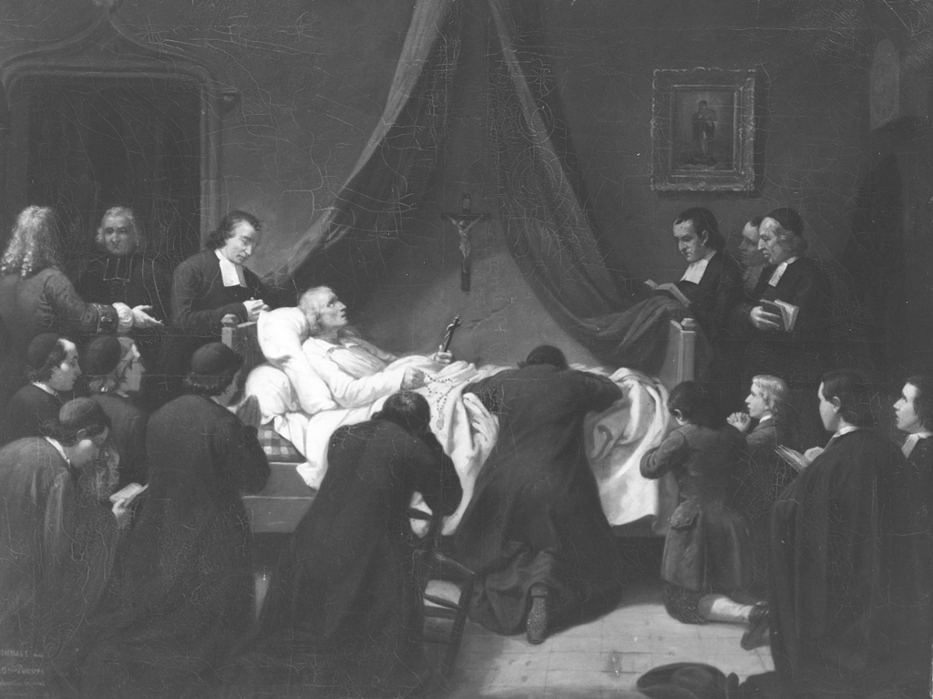 Al centro il Santo sdraiato sul letto con in mano un rosario ed un crocefisso. Intorno altri fratelli e alunni inginocchiati in preghiera.. Personaggi: Giovanni Battista de la Salle. Oggetti: crocifisso; rosario. Figure: uomini; fanciulli