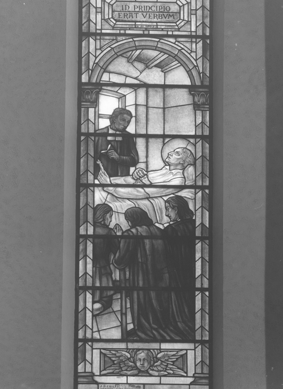 San Giovanni Battista de la Salle è raffigurato sul letto di morte con accanto quattro Fratelli.. Personaggi: San Giovanni Battista de la Salle. Figure maschili: Fratelli