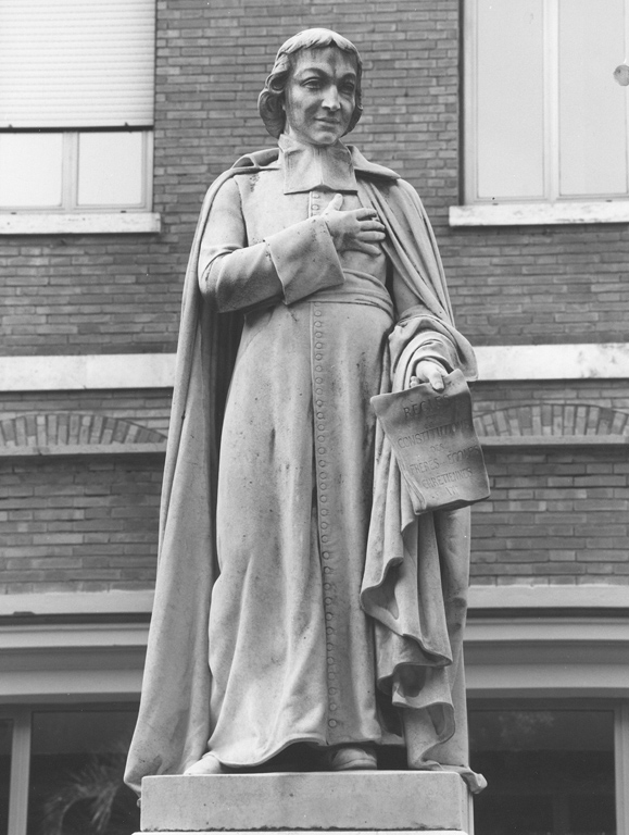 Il Santo è raffigurato in piedi con una mano al petto e nell'altra la costituzione dei Fratelli delle Scuole Cristiane.