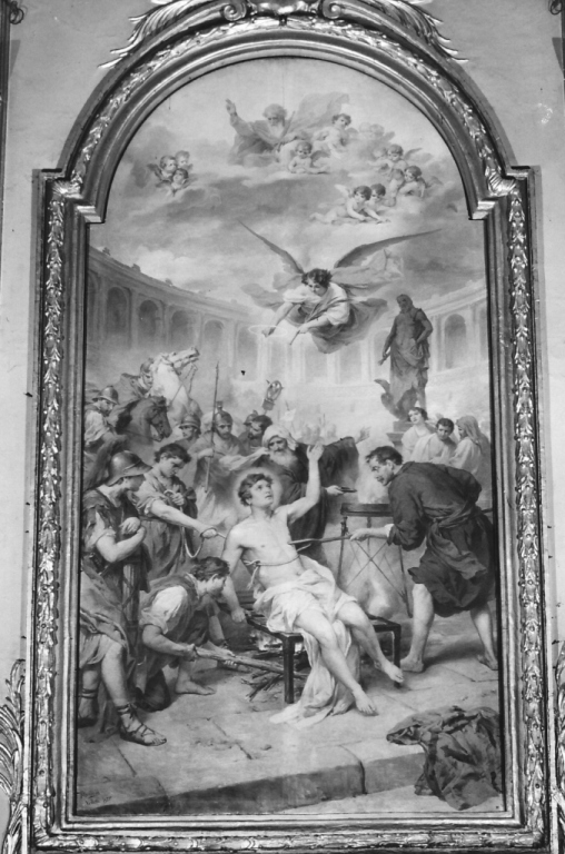 Personaggi: San Lorenzo; Dio padre; soladati. Figure: angeli; cherubini. Divinità: Giove. Attributi: (San Lorenzo) graticola; fuoco; palma. Architetture. Armi: lance. Animali: cavallo. Oggetti: tripode; corde