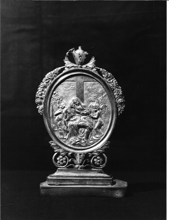 Cornice ovale poggiante su piedini a voluta e fiori, decorata in alto da ghirlande di fiori.