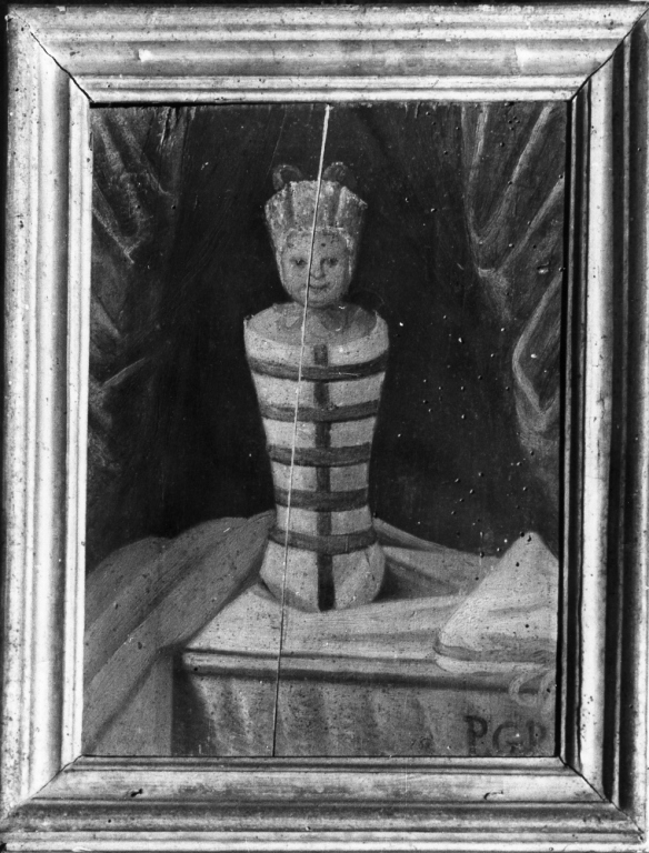 Figure: bambino. Oggetti: culla; fasciatura; cuffietta; tenda; nastro