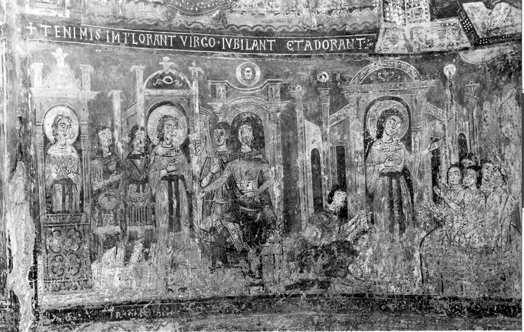 Personaggi: Santa Secondina; prefetto Valeriano. Figure: soldati; martiri. Architetture: edicole marmoree. Oggetti: tinozza con olio bollente