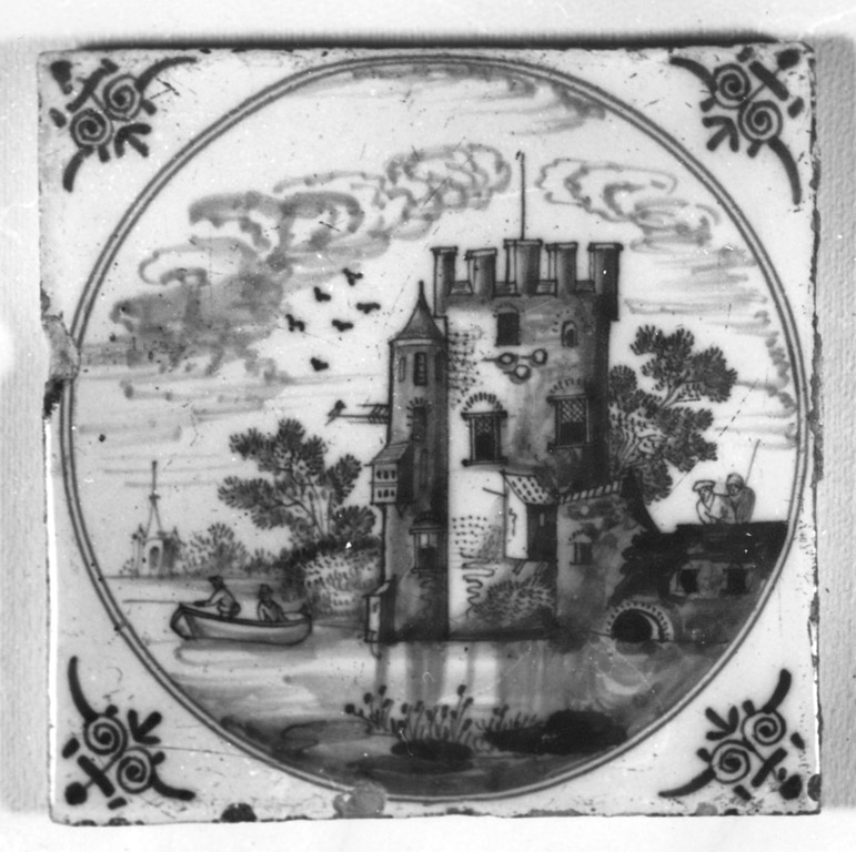Mattonella decorata in cobalto con una raffigurazione racchiusa in un cercho delimitato da una doppia riga.. Paesaggi: riva di un fiume. Architetture: torrione; torretta. Mezzi di trasporto: barca. Figure: uomini; pescatori